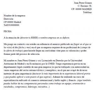 Es recomendable presentar las ventajas de la juventud, haciendo que se valore más como una oportunidad que como un incoveniente. Rellena este ejemplo de carta de presentación destacando tus cualidades, habilidades y conocimientos. Es muy importante también hacer hincapié en tu capacidad de adaptación y el rápido aprendizaje.